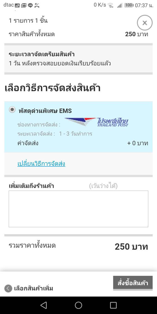และถ้าลูกค้ามีข้อความเพิ่มเติมถึงทางร้านสามารถระบุได้ในช่อง "เพิ่มเติมถึงร้านค้า" จากนั้นคลิก "สั่งซื้อสินค้า"